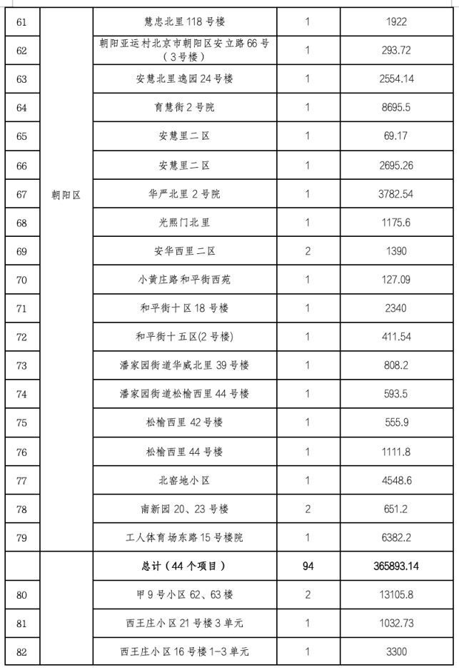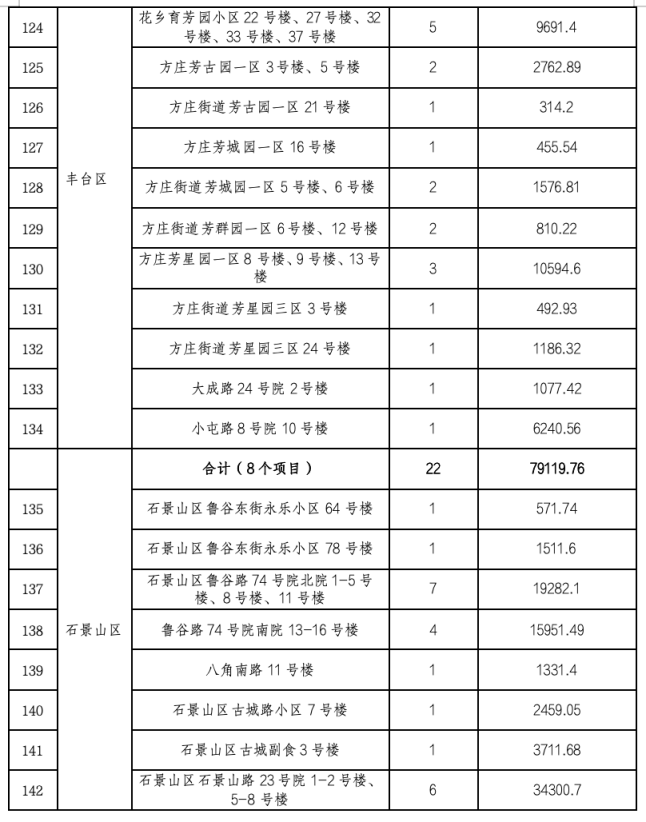具体来看,第四批申报的160个阵势,经各区审核后,最终阐述142个合乎条目。这些阵势遍布东城、西城、向阳、海淀、丰台、石景山等地区,共触及223栋楼,总建筑面积约66.7万时时米。其中,一些界限较大的小区引东谈主怜惜,举例海淀区的甲9号小区62、63楼和海淀南路2号楼;丰台区方庄芳星园一区的8、9、13号楼;以及石景山区鲁谷路74号院南院的13至16号楼等。